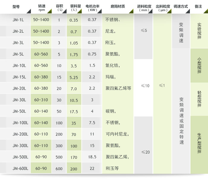 主軸帶動攪拌器高速旋轉,使研磨介質做不規則的運動,這種雜亂無序運動會產生研磨介質的碰撞、擠壓、磨擦和剪切,從而使物料粉碎、細磨。另外,研磨介質間的大小、形狀及配比不同,其獲得的研磨效果也不同。一般情況下,研磨介質的規格越大,物料粉碎越粗。反之,研磨介質越小,物料研磨越細。而不同規格研磨介質的適當配比,再加上速度的適當調節,其研磨效果佳。
