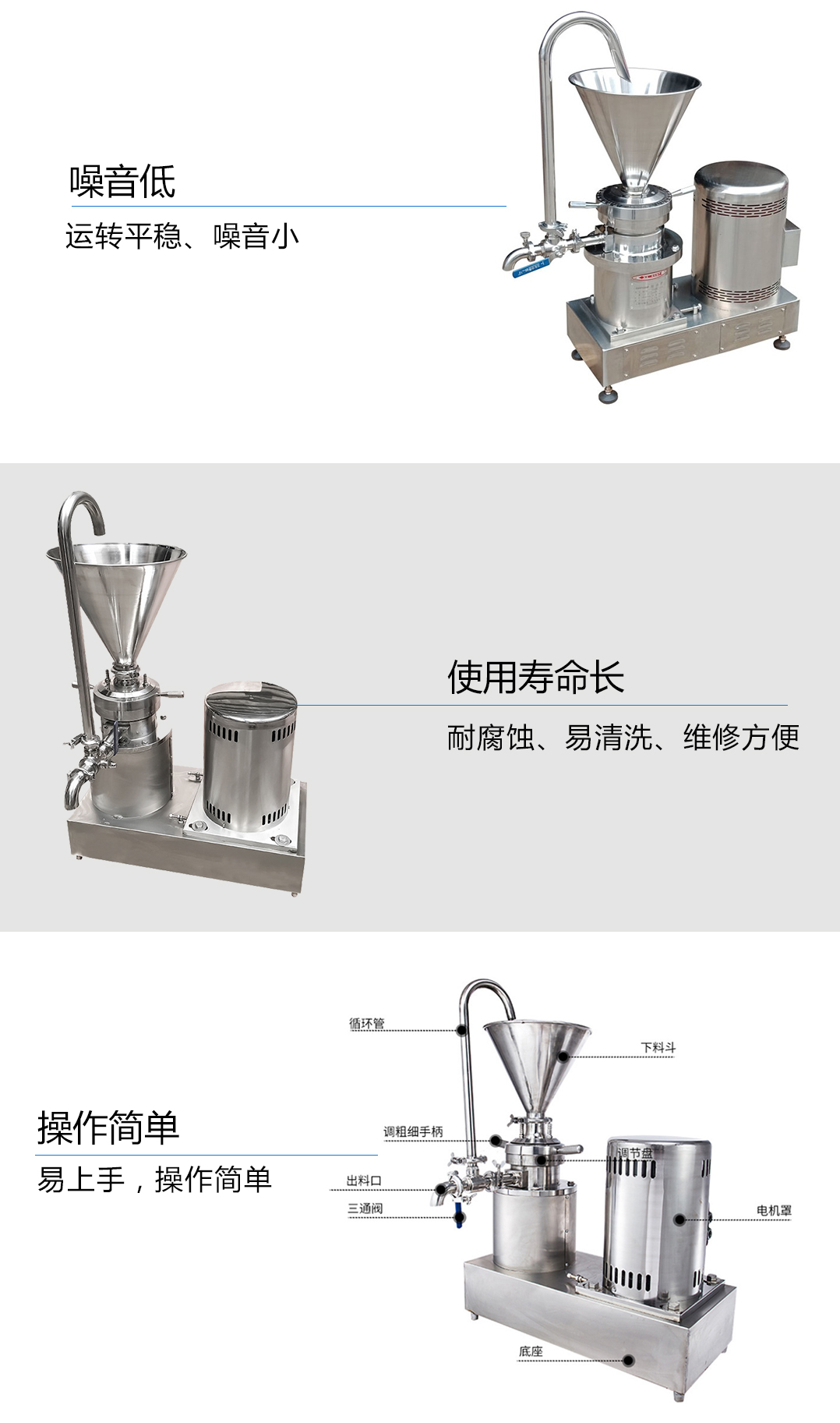 2、膠體磨分立式、臥式、分體式等多種型號規格,同物料接觸部件均采用優質不銹鋼制成,動靜磨片根據被處理物料的不同,其齒形有所區別,但材質均選用不銹鋼工具制造。