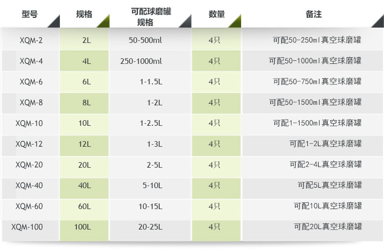 表一:低溫行星球磨機配罐參考