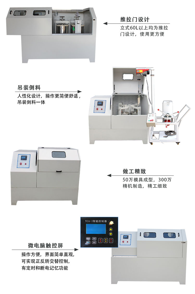 設備外殼采用加厚鋼板焊接成型加工工藝,強度高、耐沖擊、抗形變,做工精細,堅固美觀;機加零件材料嚴格熱處理工序,采用數控加工工藝,齒輪箱體采用準密封凹槽嵌入式結構,傳動齒輪選用耐磨精密齒輪,機架及結構件設計充分考慮共振因素,確保設備長期高負荷條件下穩定、安全可靠運行,并有效實現機器運轉降噪效果;液態油自潤滑裝置設計,噪音低,強度高,并配裝液態油位表,方便更換。配套吊裝及倒料裝置兩者采用一體化集成設計,倒料裝置融入振動篩分出料技術,操作簡捷,實現輕松快速取罐、卸料、裝罐,減小勞動強度,提升生產效率。采用微電腦觸控屏,操作方便,界面簡單直觀,可實現正反轉交替控制,有定時和斷電記憶功能