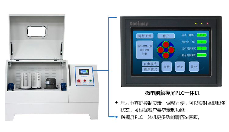 設(shè)備外殼造型設(shè)計新穎、潮流,精益制造,精致、精巧;機加零件材料嚴(yán)格熱處理工序,采用數(shù)控加工工藝,傳動齒輪選用特殊材料精密齒輪,確保設(shè)備高速運行時平穩(wěn)、安全、安靜;磨罐壓緊裝置操作便捷、安全可靠,采用微電腦觸控屏,操作方便,界面簡單直觀,可實現(xiàn)正反轉(zhuǎn)交替控制,有定時和斷電記憶功能 。