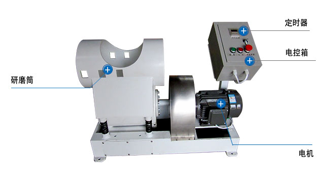 實驗振動磨機主要由機架、底架、激振器、磨筒、彈簧、電機等組成,機器啟動時,電機驅動激振器,產生激振力,使磨筒作高頻小振幅的連續振動。由于磨介的自轉和相對運動對物料產生頻繁沖擊與磨剝作用,從而達到均勻粉碎物料的目的。